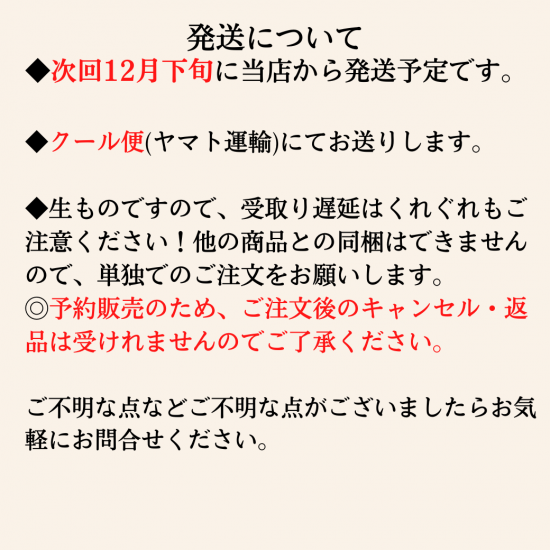 ・次回12月下旬に発送を予定しておりますが、天候により前後する場合がございます。